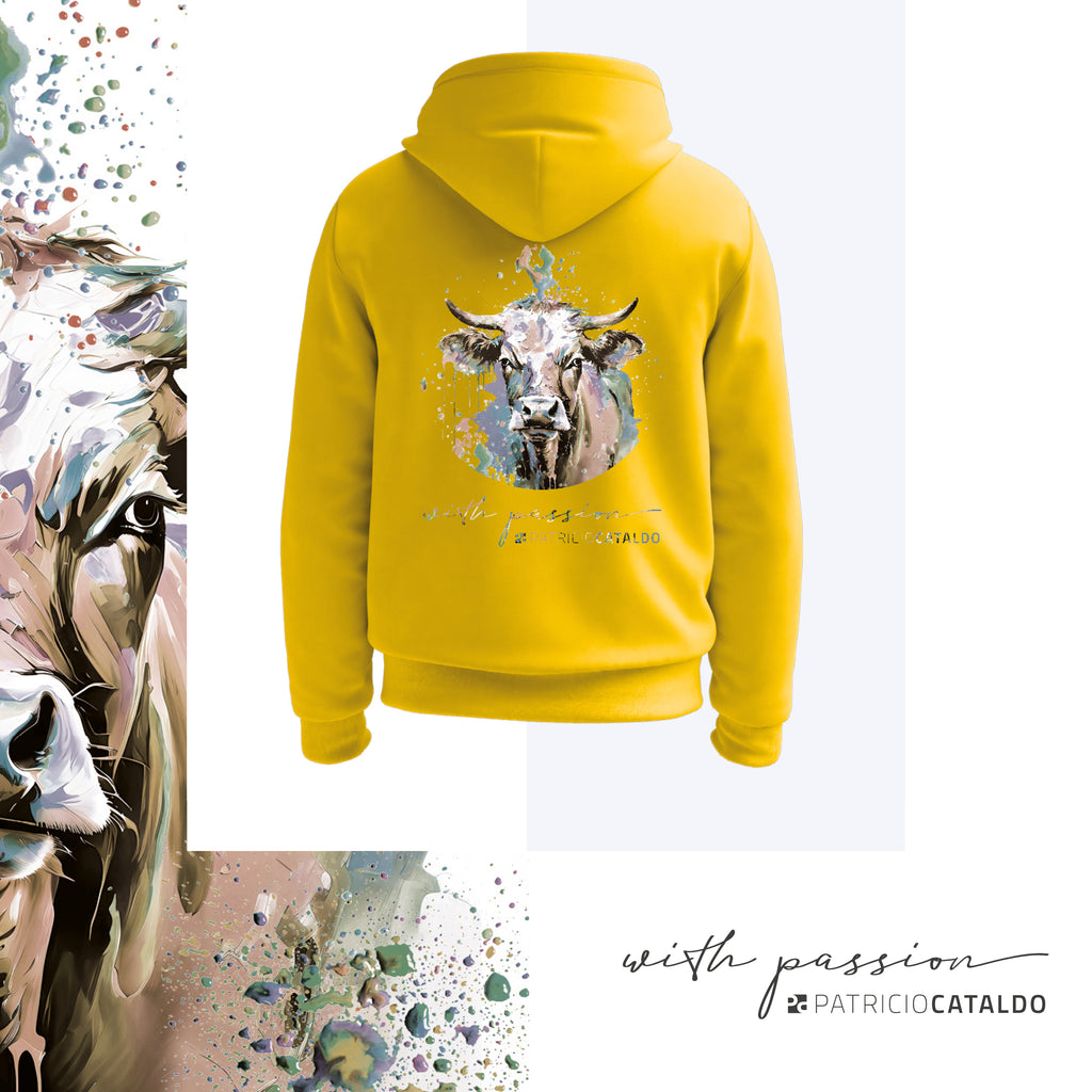 Unisex Kapuzenpullover * Hoodie * Kuh "Mimi" Pastell Print * gelb * Patricio Cataldo * 80% Bio Baumwolle * 20% recycelter Polyester * Hergestellt in Polen