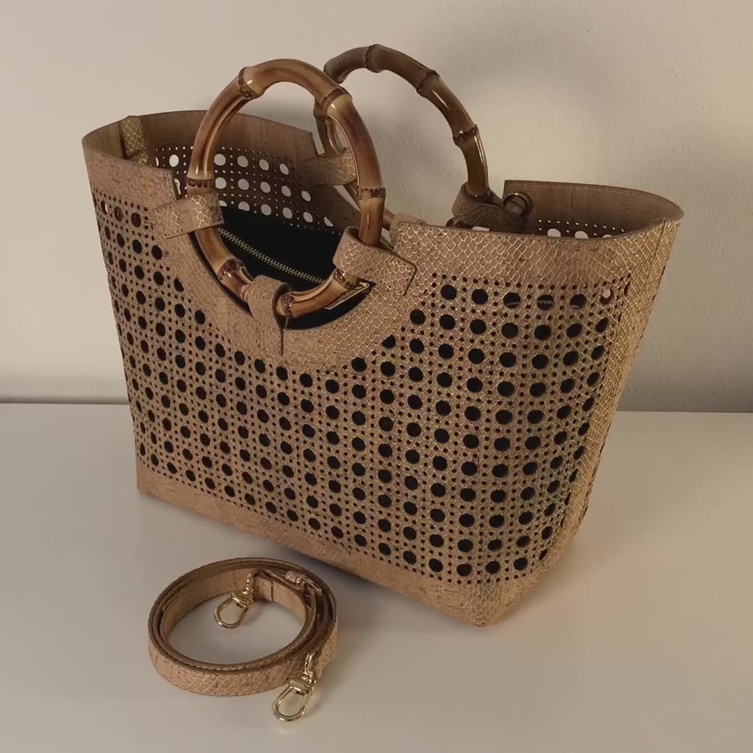 - Tragevarianten: 2 Tragegriffe aus Bambus und Schulterriemen aus Kork