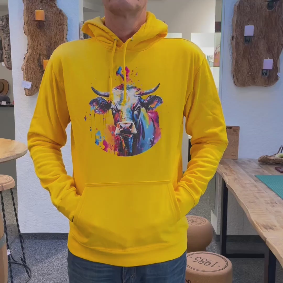 Unisex Kapuzenpullover * Hoodie * Kuh "Mimi" Farbenzauber Print * gelb * Patricio Cataldo * 80% Bio Baumwolle * 20% recycelter Polyester * Hergestellt in Polen