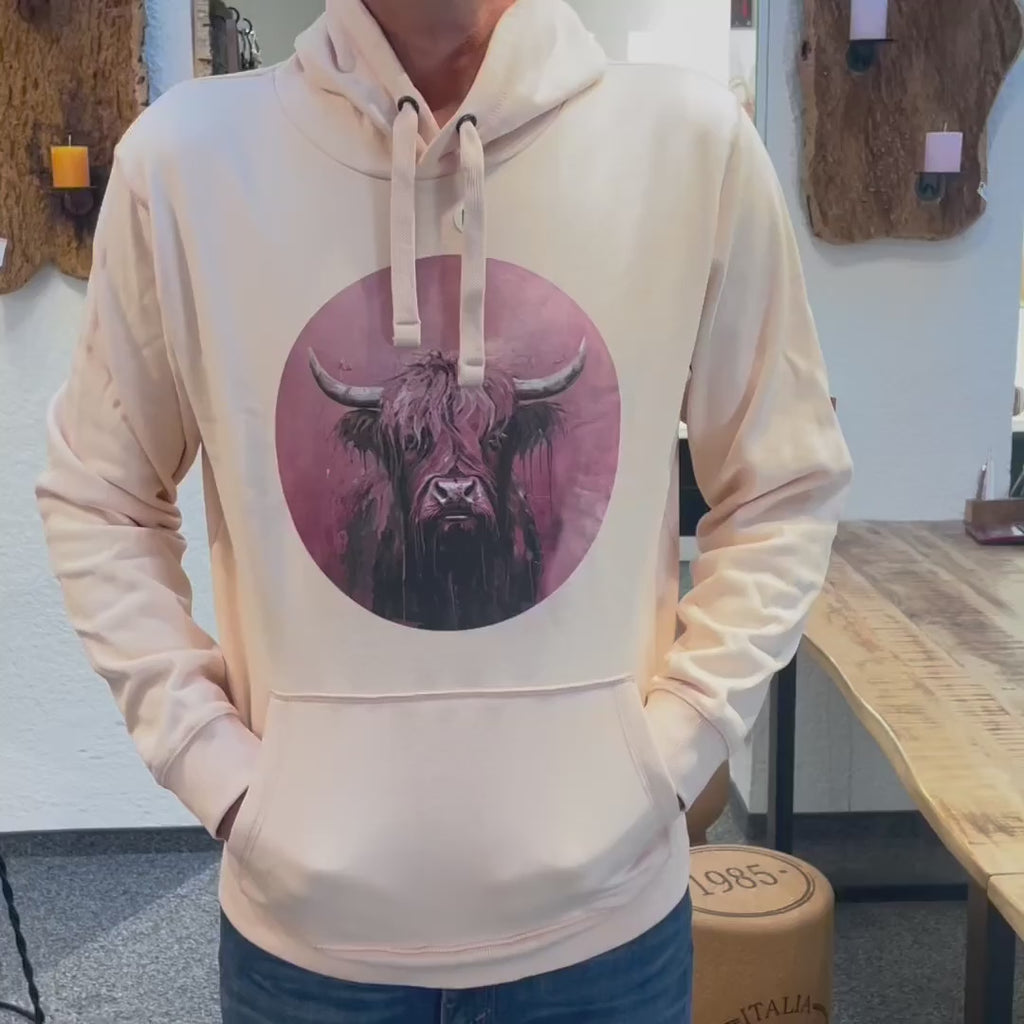 Unisex Kapuzenpullover * Hoodie * Kuh "Vreni" Print * Pfirsich Rosa * Patricio Cataldo * 80% Bio Baumwolle * 20% recycelter Polyester * Hergestellt in Polen