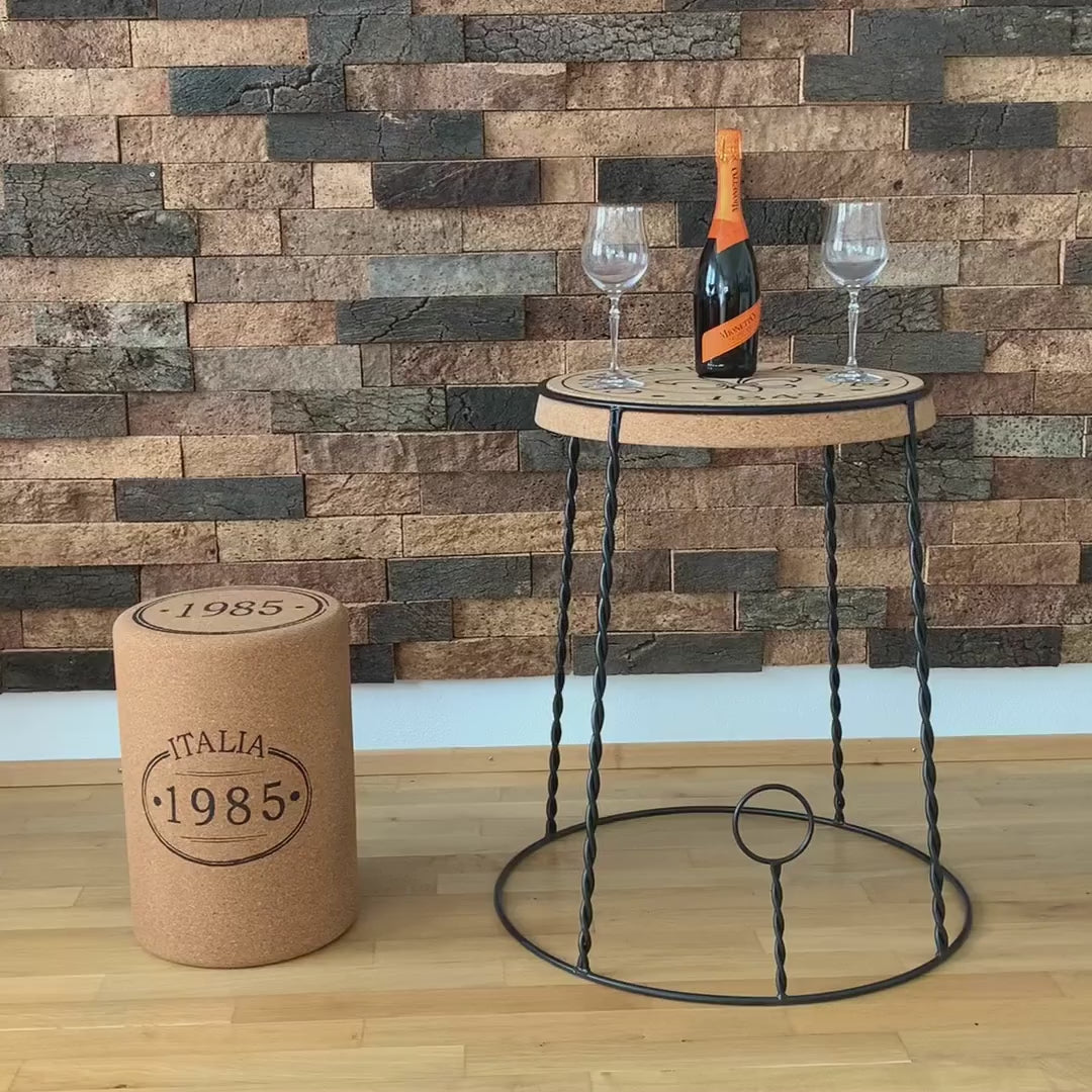 Barmöbel in Form eines Champagner-Korken: verKORKst Premium Kork-Beistelltisch und Hocker in Form ein riesigen C