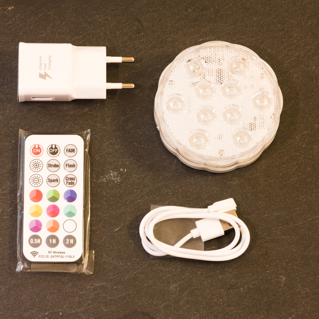 Beleuchtung gegen Aufpreis: LED wasserdicht, 10 LED RGB, Funk-Fernbedienung, 25 Farben, 5 dynamische Farbwechsel-Modi (davon einer als Fading-Modus), Timer, dimmbar. Zu betreiben über einen integrierten Akku, welcher über USB geladen werden kann.